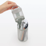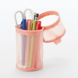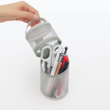 Un estuche para bolígrafos elaborado con tela de malla de nailon ligera y duradera, estructurada de manera que pueda abrirse tanto horizontal como verticalmente para su comodidad.