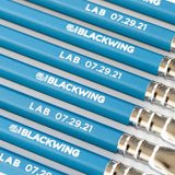 Lápices de edición limitada con un núcleo azul no fotográfico que desaparece en escaneos y fotocopias. Cuerpo bitono azul y natural, férula plateada, clip plateado, goma de borrar blanca e impresión de la marca y número de laboratorio en color blanco.