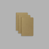Nuestras básicas originales kraft tienen 60 páginas totales y tú eliges el tipo de layout interior: rayas, cuadros, puntos, ahuesado o liso. Cada libreta mide 9x14 cm y esta cosida a mano al lomo. Sí, a mano, una por una. Cada kit tiene 3 libretas.
